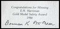 "Congratulations for Winning E.H. Harriman Gold Medal Safety Award 1986"